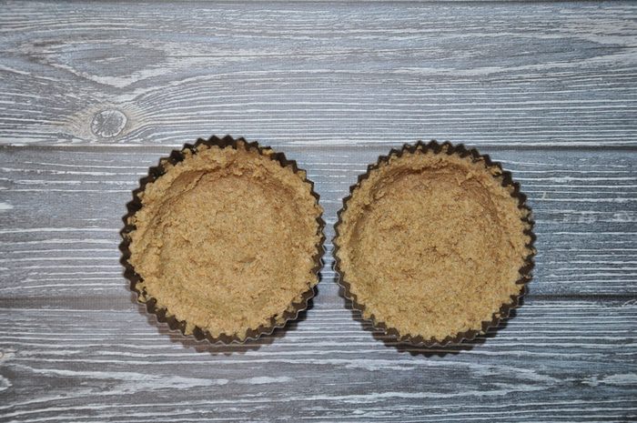Выложите тесто в силиконовые формы слоем, толщиной примерно 0,5 см, и поставьте тарталетки в микроволновую печь на 2,5 минуты при мощности 800 Вт. Готовые тарталетки достаньте и дайте остыть.