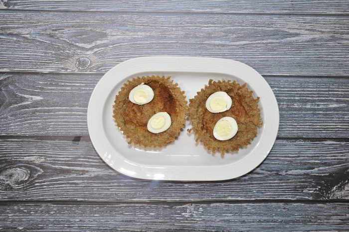 Перепелиные яйца заранее отварите, разрежьте пополам и уложите на дно тарталеток.