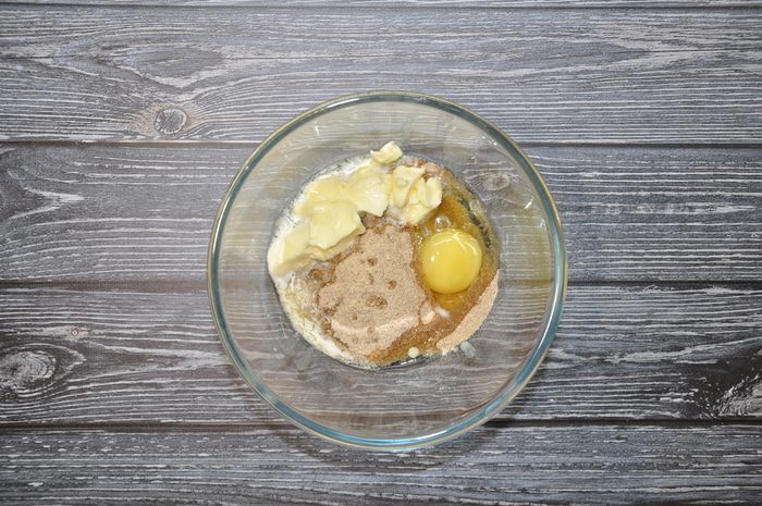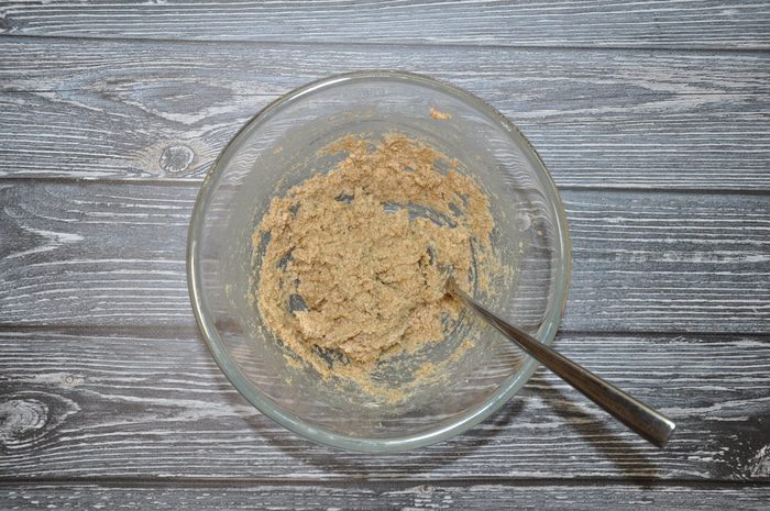 Далее вы можете приступить к приготовлению тарталеток. Положите в миску размягченное сливочное масло, измельченные отруби, муку и одно куриное яйцо.