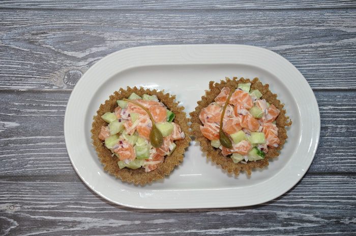 Тарталетки очень быстрого приготовления, подойдут в качестве красивой и полезной закуски. Семгу лучше взять слабосоленую, но можно взять свежую, предварительно замариновав ее с луком и солью.