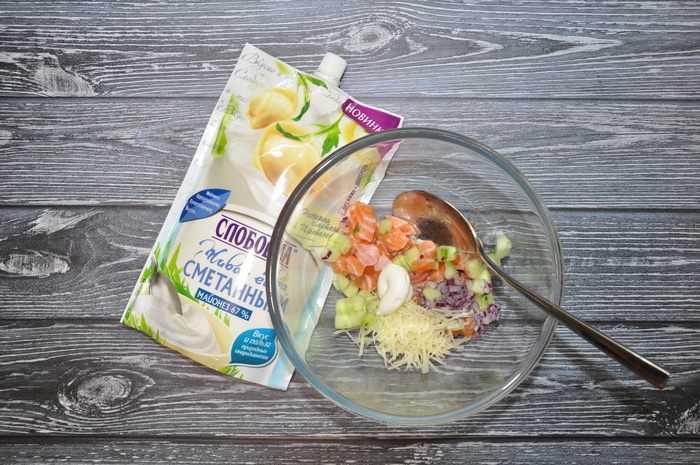 Приготовьте салат для тарталеток: в отдельную посуду положите огурцы, семгу, лук и пармезан, заправьте майонезом ТМ «Слобода» Сметанный и перемешайте.