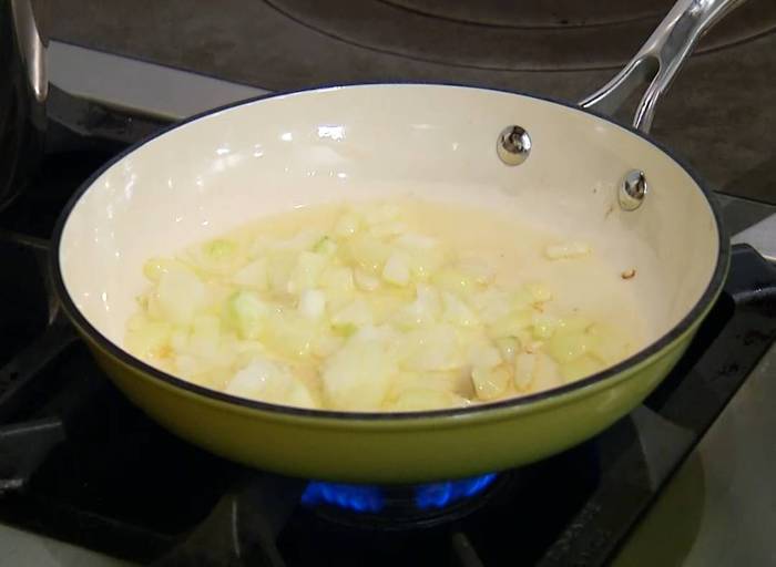 Разогреть в сковороде оливковое масло и обжарить лук и чеснок до золотистого цвета.