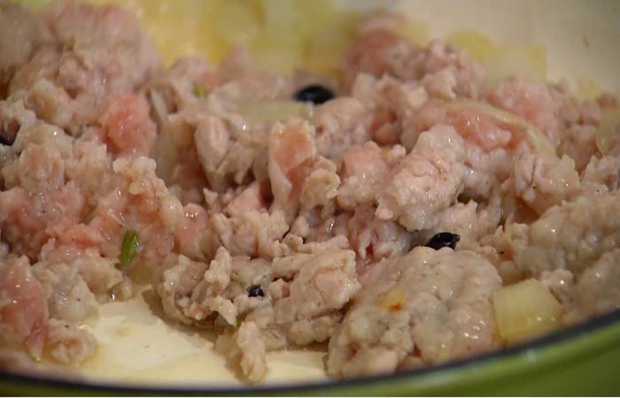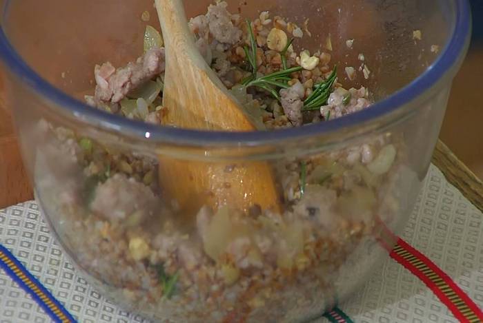 Нарезанные каштаны соединить с фундуком, листьями розмарина и тимьяна, запаренной гречкой и обжаренным фаршем, все посолить, поперчить и перемешать.