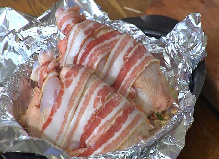 Сало можно заменить беконом. Вместо каштанов подойдет каштановое пюре, а вместо свежих травок — сухие. Колбаски лучше взять свиные — в них есть жирок, который изнутри пропитает цыплят.