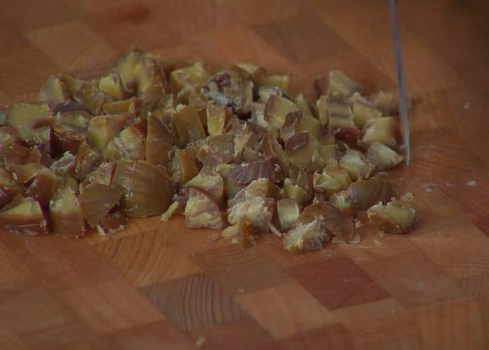 Каштаны нарезать небольшими кусочками.