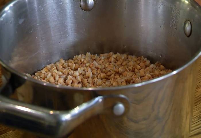 Гречку всыпать в кастрюлю, залить кипятком, накрыть крышкой и оставить на час.