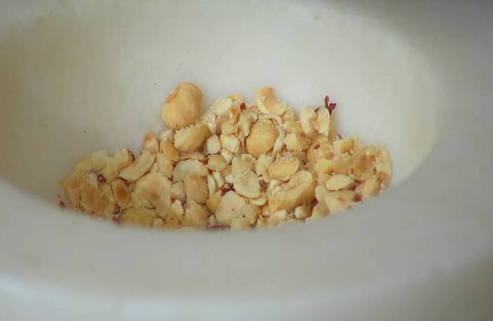 Фундук измельчить в ступке на небольшие кусочки.