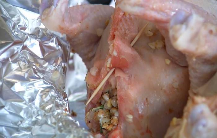 Куриные тушки вымыть, обсушить, плотно наполнить начинкой, скрепить зубочистками и выложить на противень, выстеленный двойным слоем фольги.