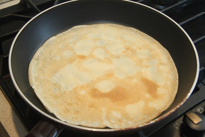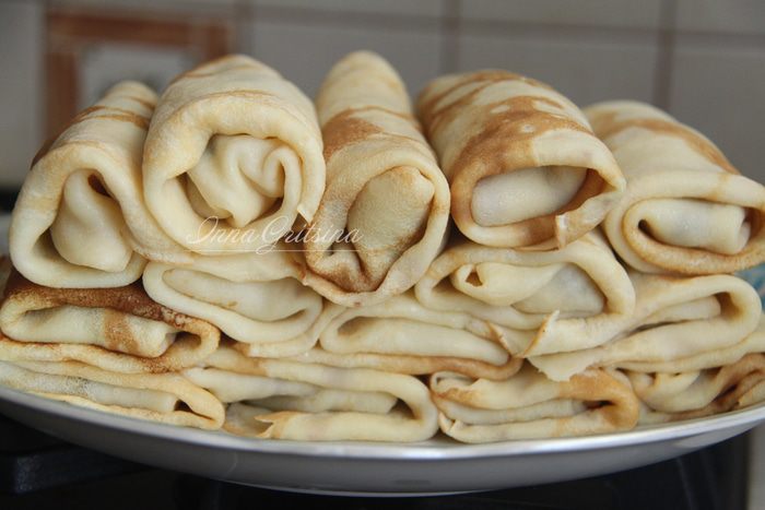 Тесто наливать порциями по 100 — 120 мл на тщательно разогретую сковороду (диаметр 24 см), жарить блины до румяного цвета с обеих сторон.