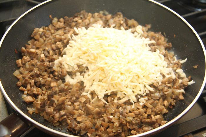 Добавить моцареллу, натертую на крупной терке, перемешать. Жюльен готов!