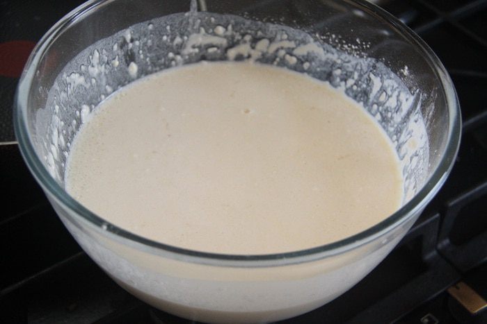 Молоко слегка подогреть. Соединить ингредиенты для блинного теста: 2 яйца, 900 мл теплого молока, 1 ч. л. соли, 2 ст. л. сахара, 330 г муки в/с, 1 ч. л. разрыхлителя, по 2 ст. л. горчичного и подсолнечного масла. Дать тесту постоять минут 10 — 15.