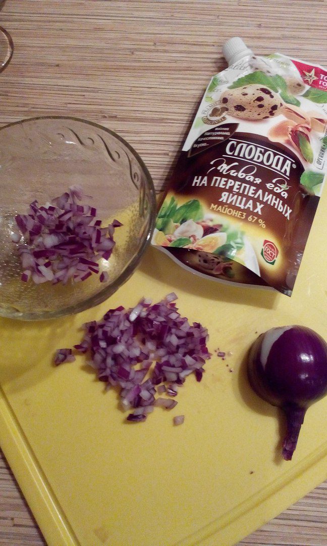 Первым слоем будет мелко нашинкованный красный лук. Можно использовать и обычный репчатый, но для удаления горечи его нужно будет обдать кипятком.