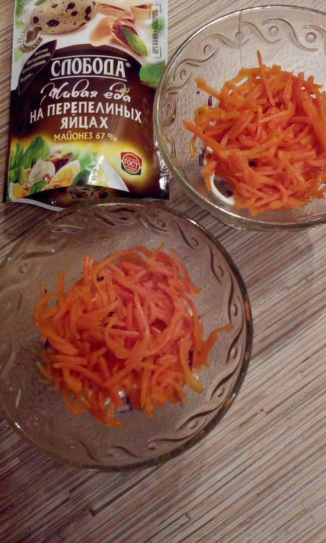 Далее уложите слой морковки по-корейски. Если ее полоски слишком длинные, то ее лучше измельчить.
