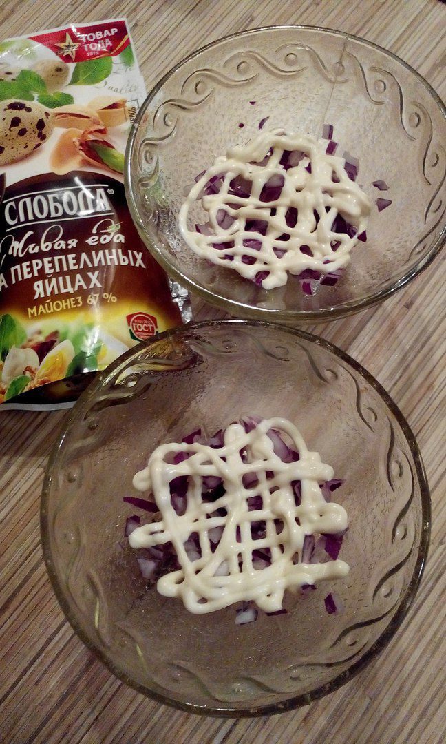 Поверх лука наносим густую сетку из майонеза.