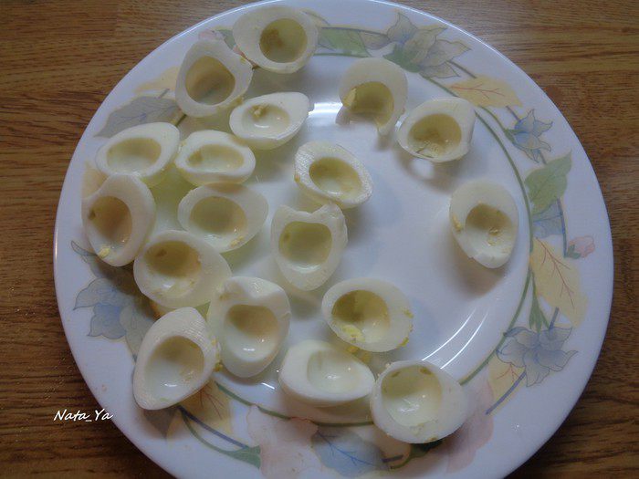 Отварить перепелиные яйца, остудить, очистить и вынуть желток.