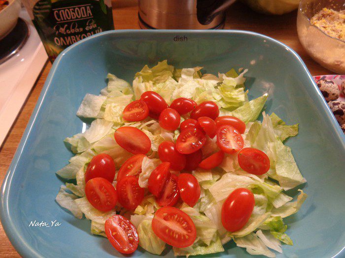 Салат айсберг порежем квадратами, добавим к нему помидоры черри, порезанные пополам.