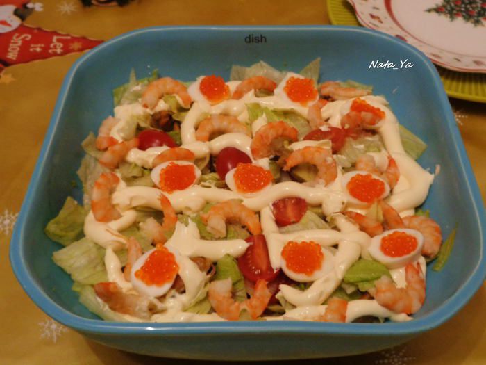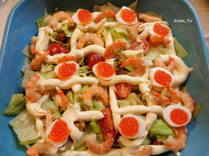 Предлагаю вам попробовать очень вкусный, неизбитый морской салат, в состав которого входят тигровые креветки, мидии, красная икра. Такой салат станет достойным украшением любого праздничного стола, а майонез ТМ «Слобода» Оливковый как нельзя кстати подойдет к нему.