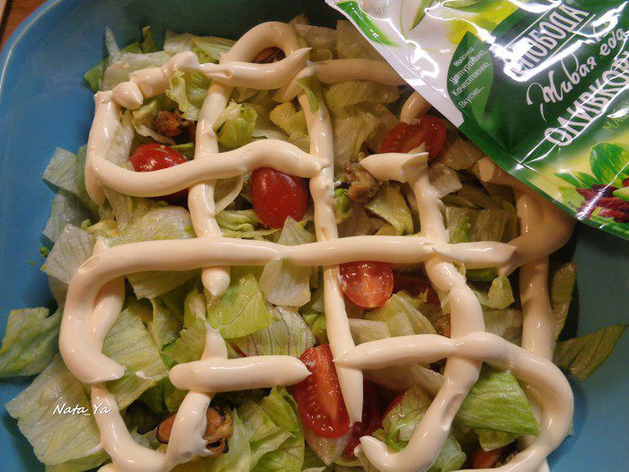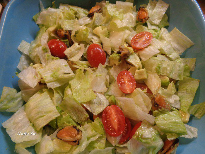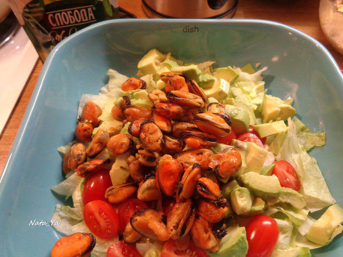 Добавим к салату мидии.