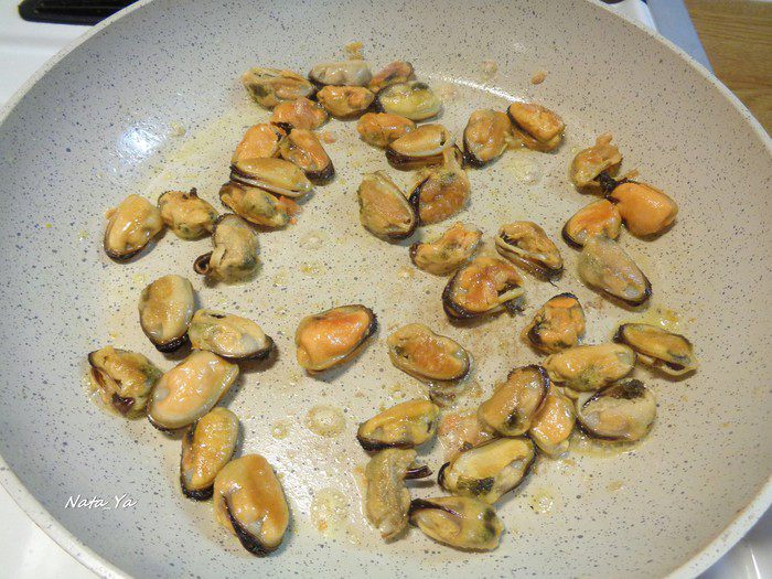 В воде из-под креветок отварить замороженные мидии (как только вскипят, вынуть) и спассеровать их немного на сковородке с оливковым маслом.