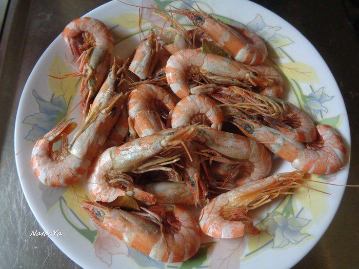 Замороженные креветки отварить в подсоленной воде с добавлением лаврового листа и черного перца горошком в течение 5 минут. Вынуть шумовкой и оставить остужать. Потом очистить.