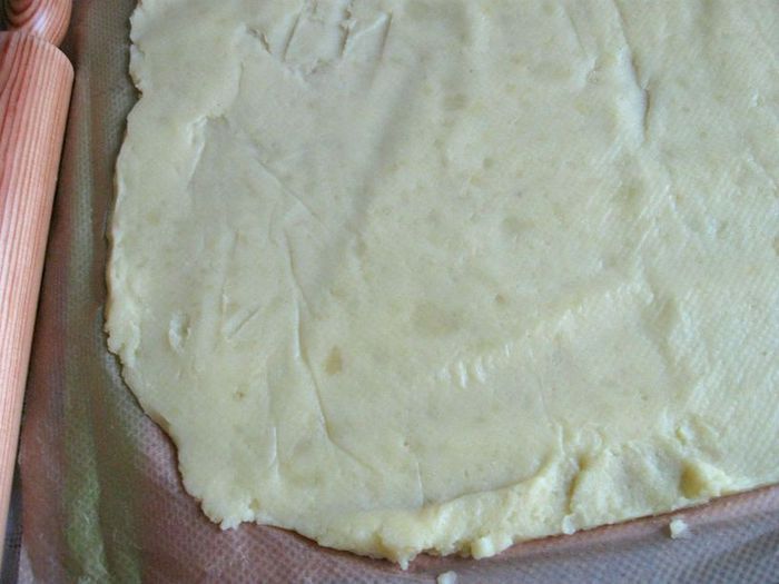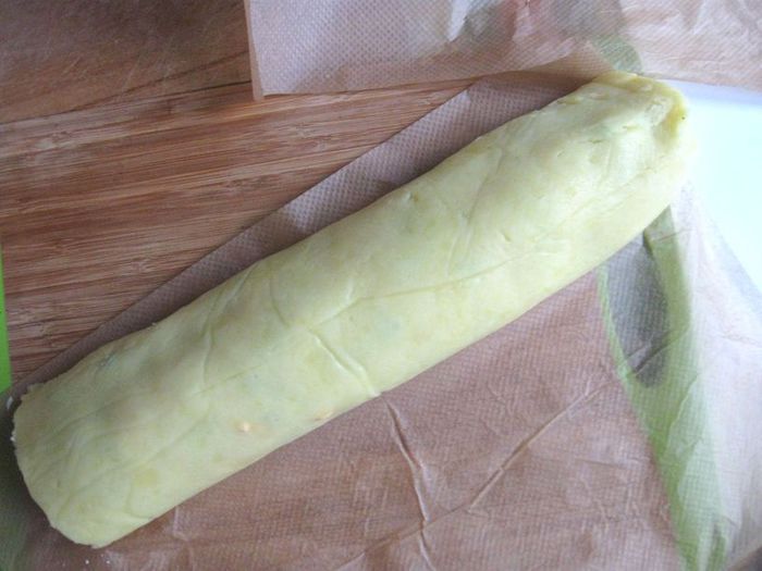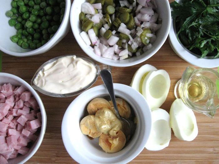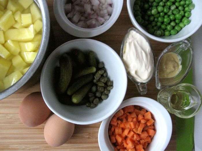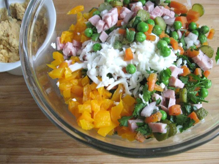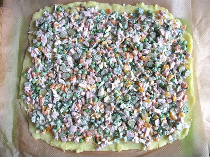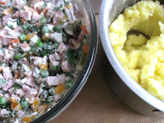 Белок от 1 яйца натереть на крупной терке. Второй белок, натертый на мелкой терке, можно использовать для украшения. Я так делала в предыдущем рулете (ссылка в описании рецепта). Болгарский перец запечь в течение 30 минут в фольге в духовке, остудить под холодной водой, нарезать небольшими кубиками. Смешать горошек, морковь, перец (его надо немного отжать, чтобы не было лишней жидкости), белок, измельченную зелень петрушки, ветчину, огурцы с каперсами и луком. Желтки с горчицей и соевым соусом можно добавить к начинке, а можно ими обмазать картофельное тесто (так поступила я).