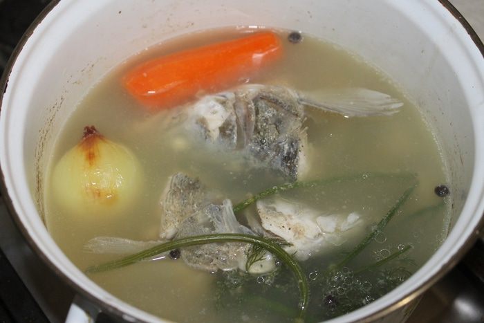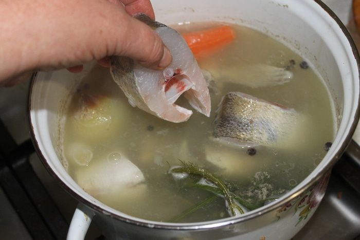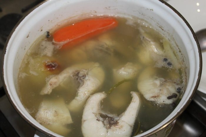 Отделите голову, плавники и хвост, залейте холодной водой, добавьте морковь, лук, веточки укропа и специи. Варите наваристый бульон на медленном огне в течении 30 минут.
