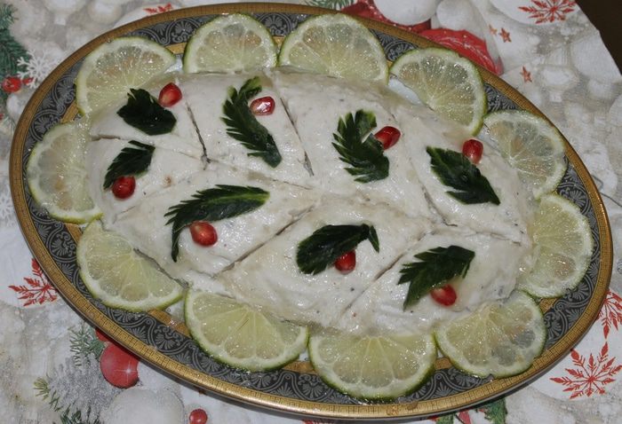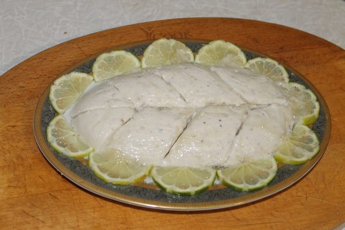 Нарежьте тонкими ломтиками лимон, разложите вокруг рыбы. Сверху налейте немного рыбного бульона, украсьте по своему усмотрению и отправьте в холодильник на 15 минут.
