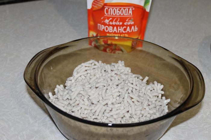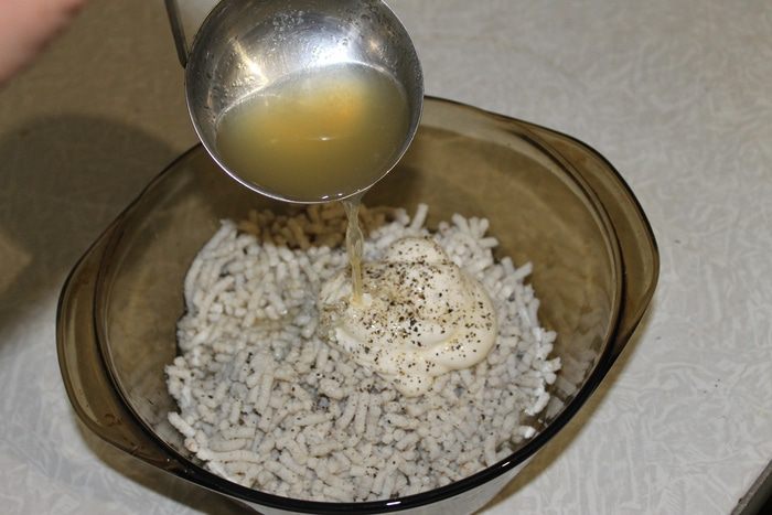 Добавьте майонез, перец и немного бульона с желатином, перемешайте, взбейте немного вилкой.