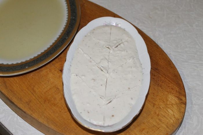 Рыбную массу выложите в овальное блюдо и отправьте в холодильник, для застывания. Немного рыбного бульона налейте на сервировочное блюдо и так же поставьте в холодильник.