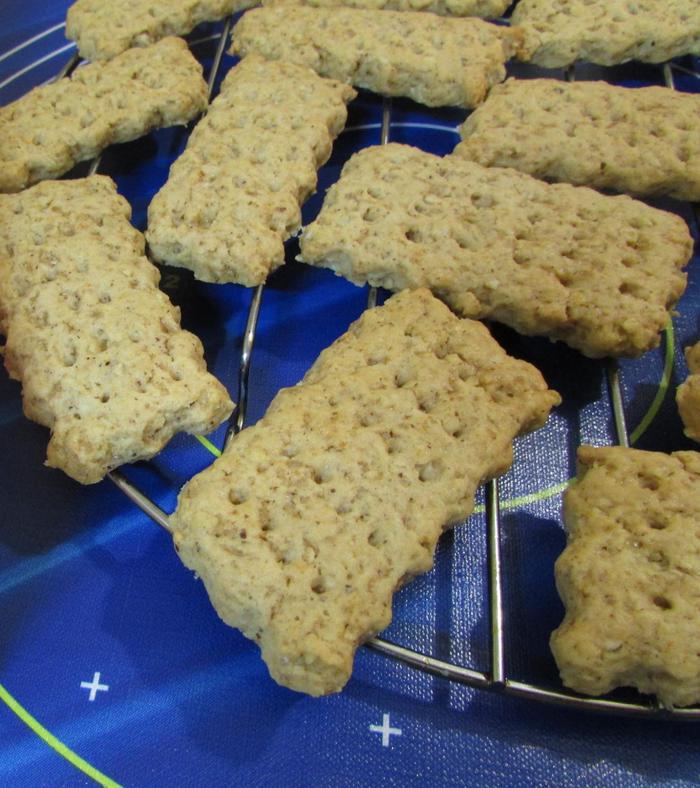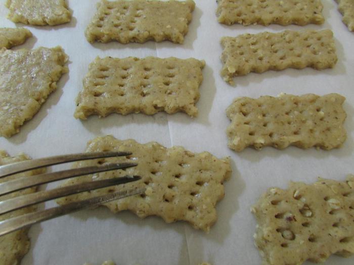 Противень застелить пекарской бумагой. Печенье выложить на подготовленный противень. И наколоть каждый крекер вилкой. Отправить в разогретую духовку до 160°С. Выпекать 12 — 15 минут.