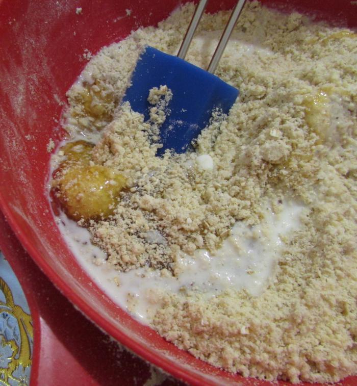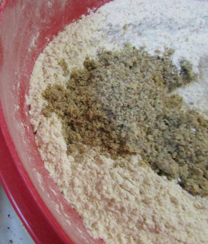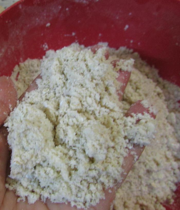 Растереть до получения масляно-мучной крошки.