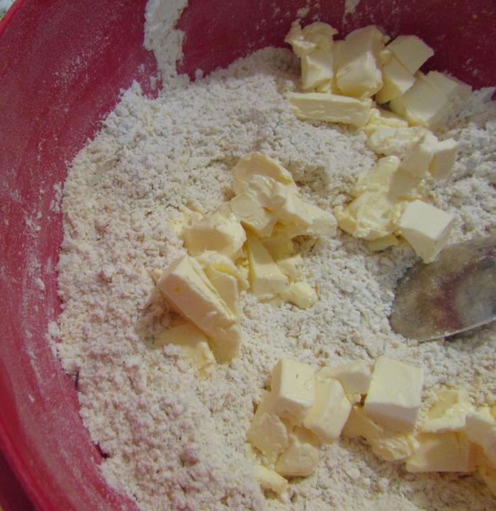 Сливочное масло комнатной температуры порезать небольшими кусочками и добавить к муке.