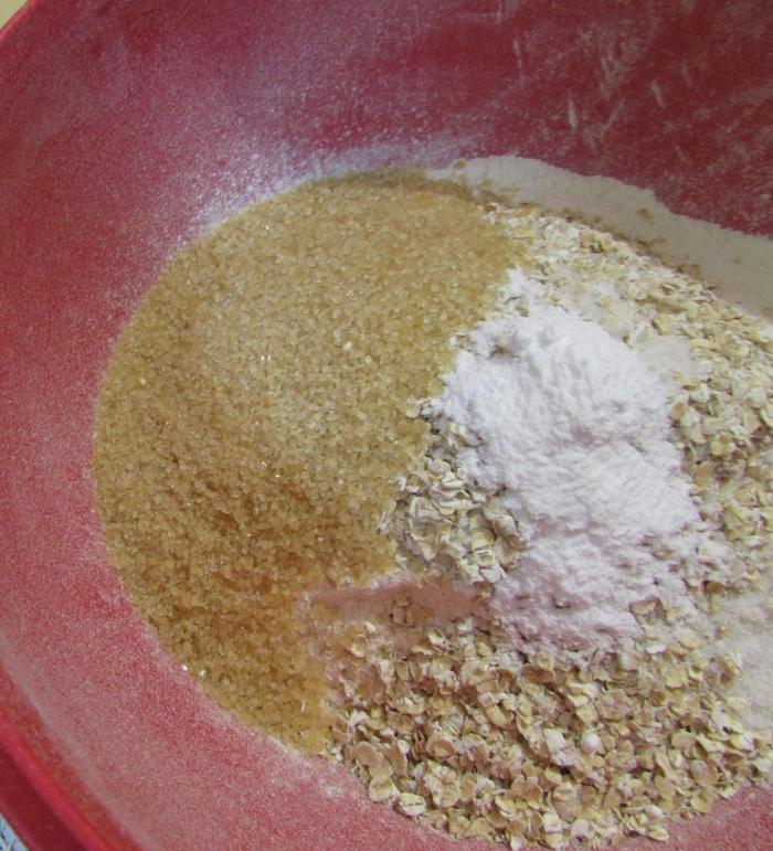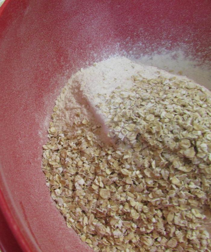 В миске смешать муку и овсяные хлопья.