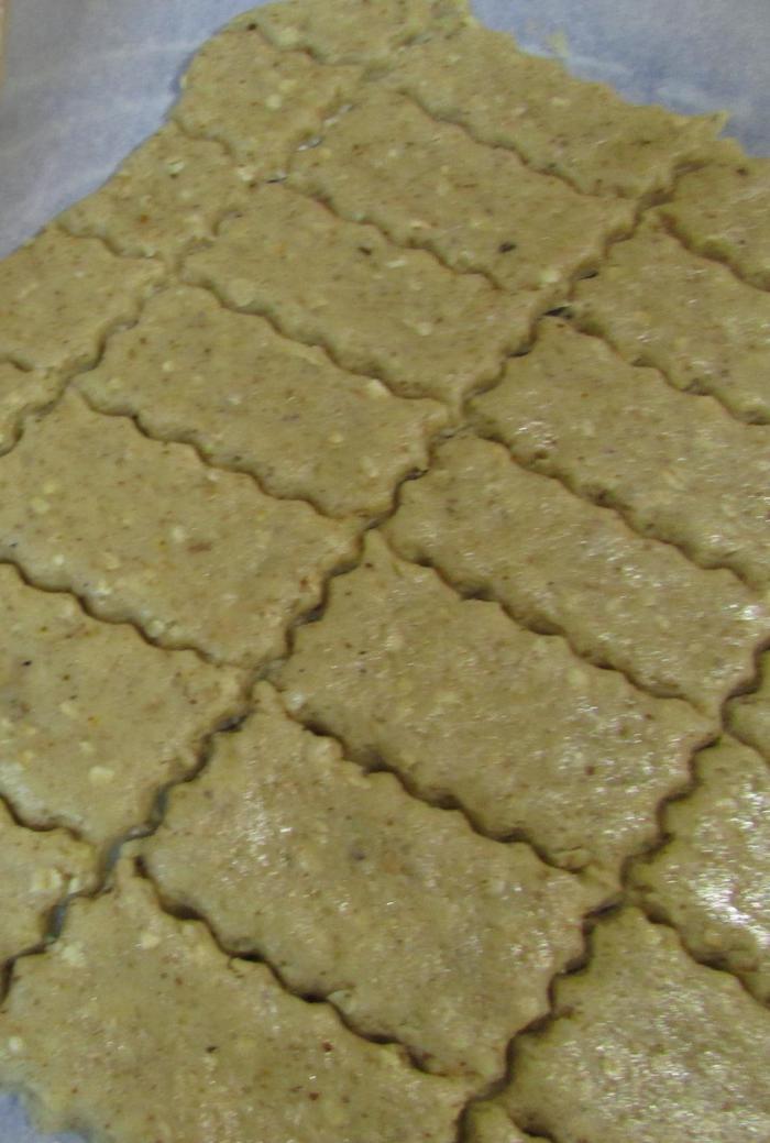 Каждую часть теста раскатать между двумя листами пергамента до толщины 5 — 7 мм. И нарезать на небольшие прямоугольнички.