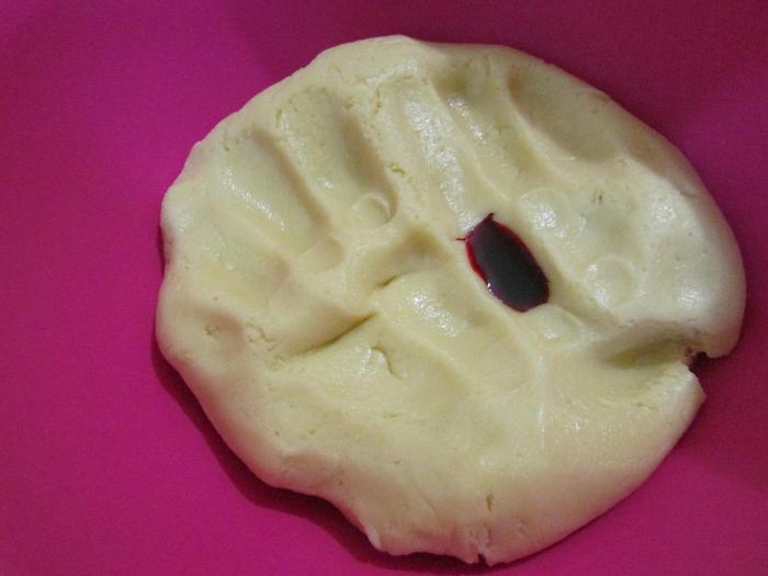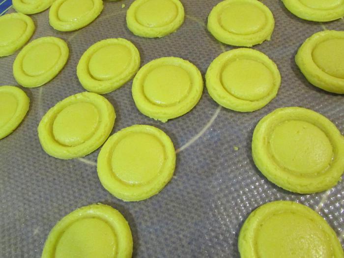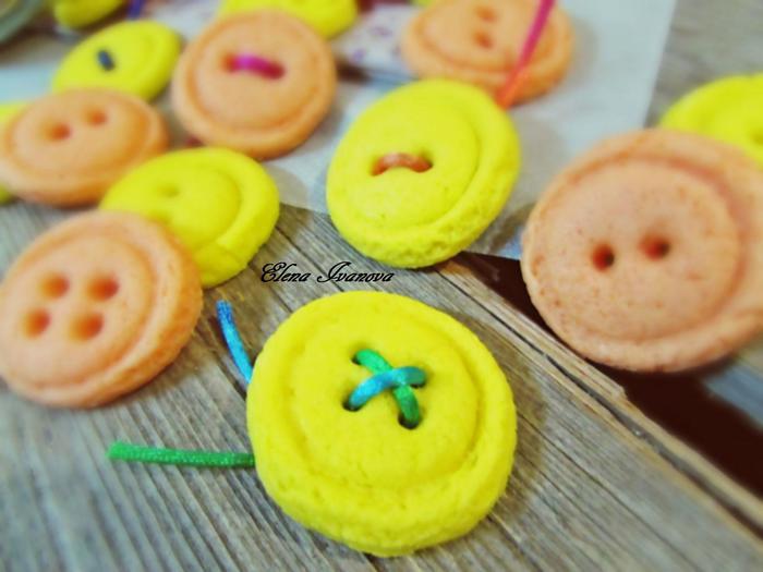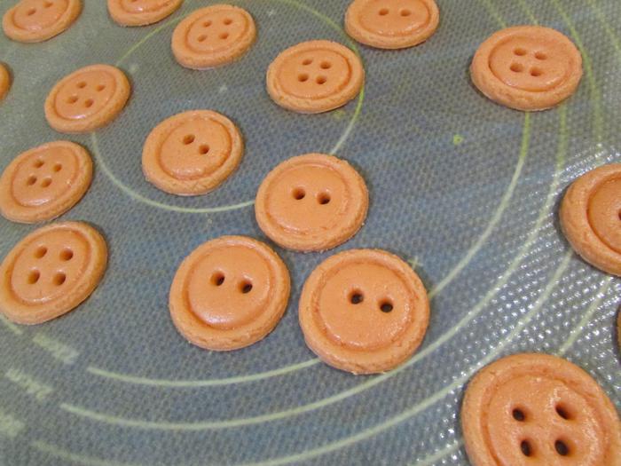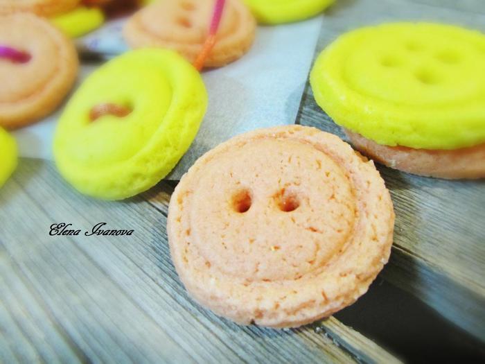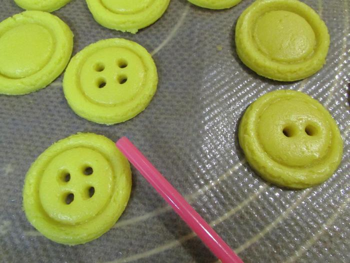 Повторить весь процесс с тестом другого цвета. Выложить пуговицы на противень, застеленный пергаментной бумагой и поставить в холодильник на 15 минут перед выпеканием. Затем отправить в духовку 175°С на 8 — 10 минут.