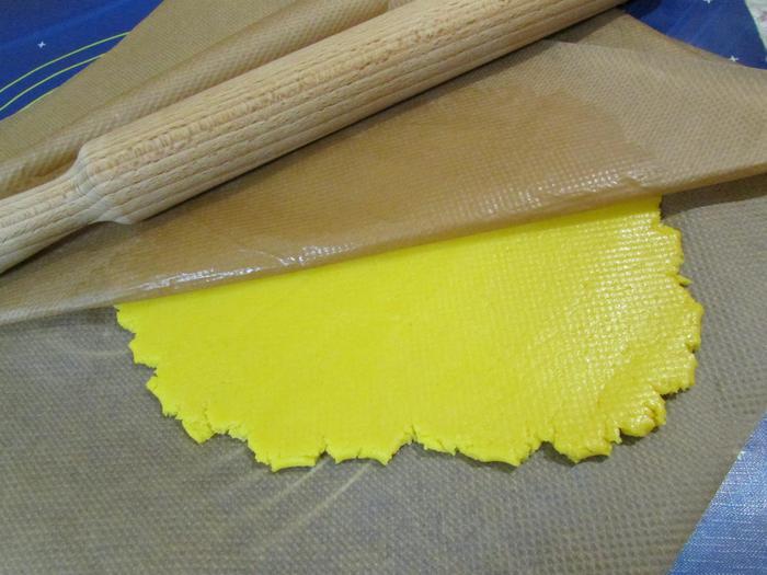 Достать тесто из холодильника и раскатать между двумя листами пергамента.