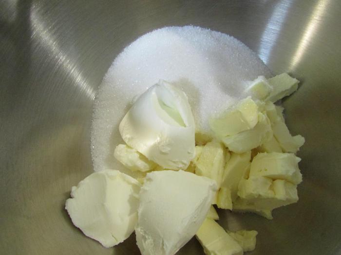 Взбить сливочное масло, сливочный сыр и сахар до воздушного состояния.