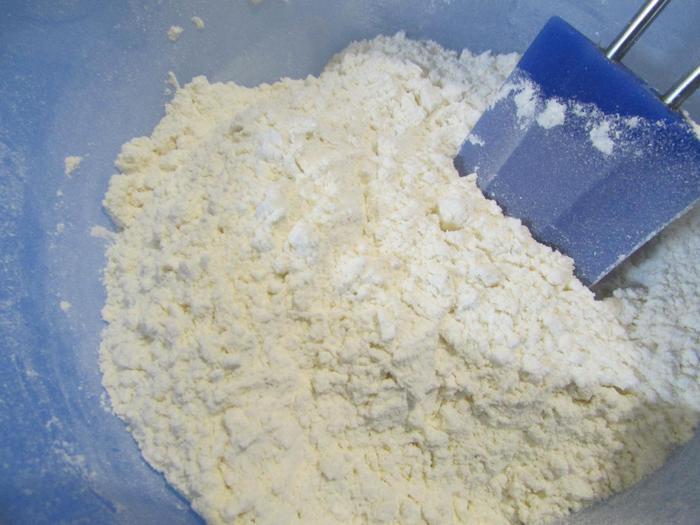 Всыпать сухие ингредиенты в кремовую массу. Замесить тесто и разделить его на 2 части.