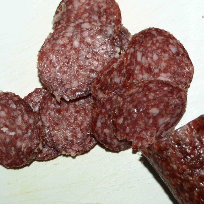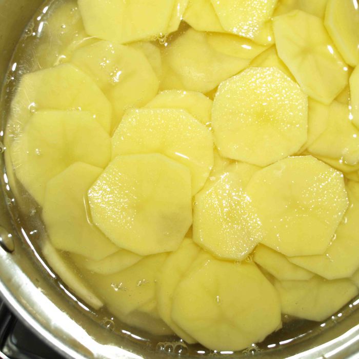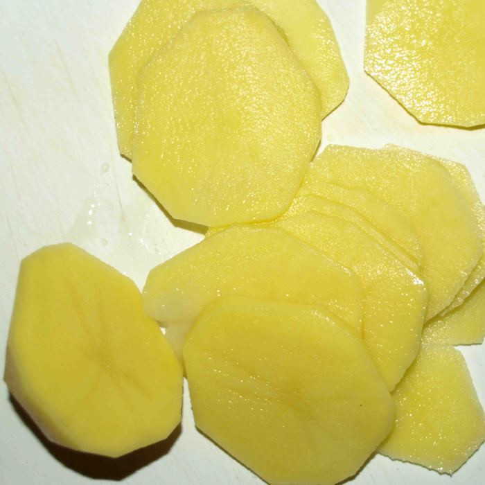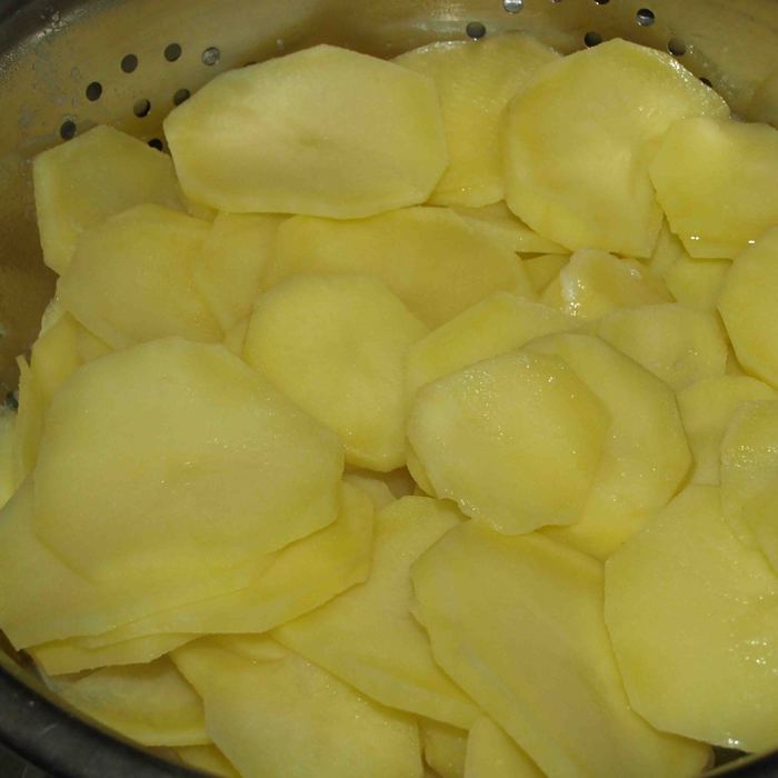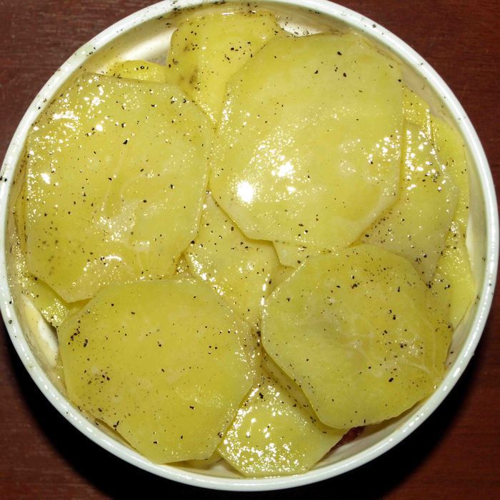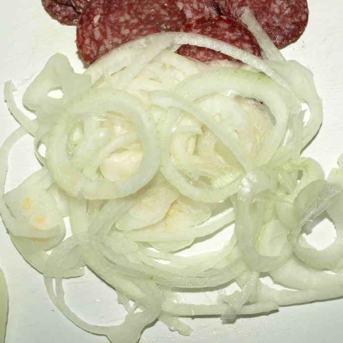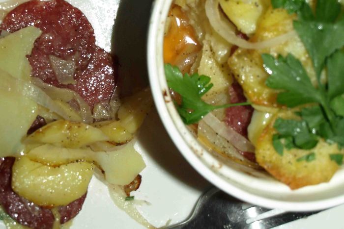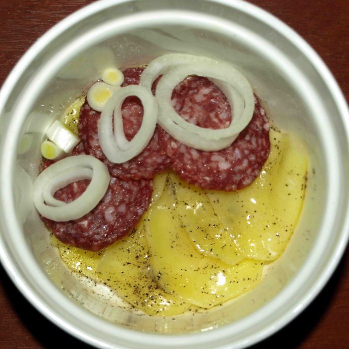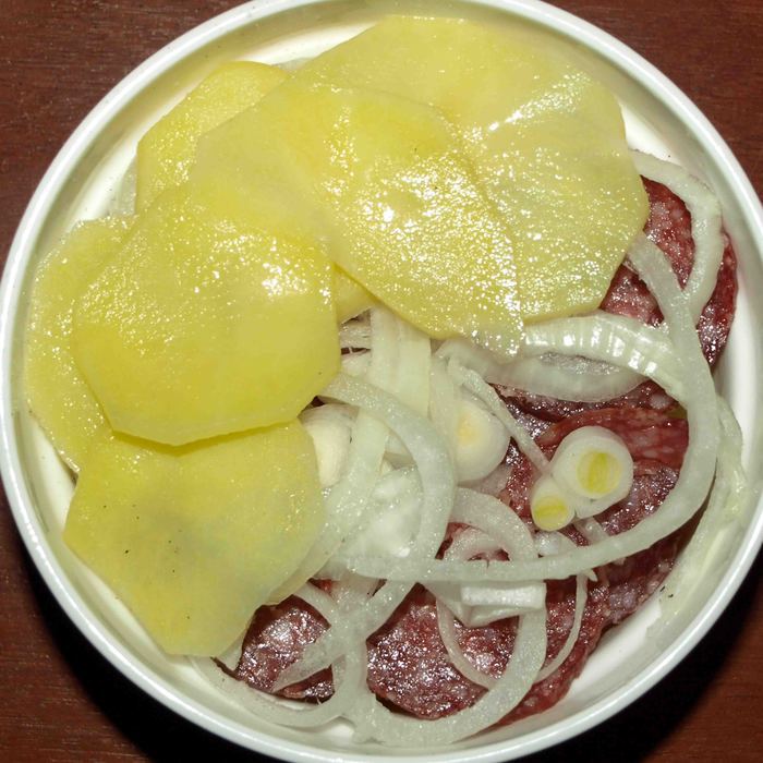 Получается три слоя картофеля и два слоя салями с луком.