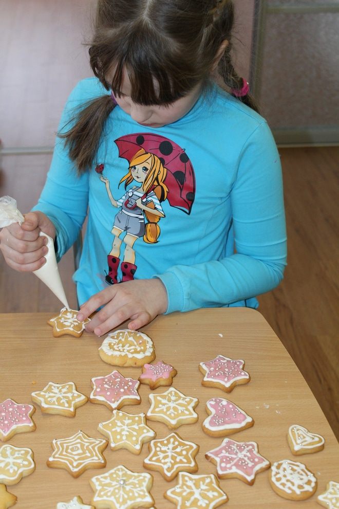 Взбить один белок со стаканом сахарной пудры, поместить в корнетик и с помощью ребенка украсить печенье!