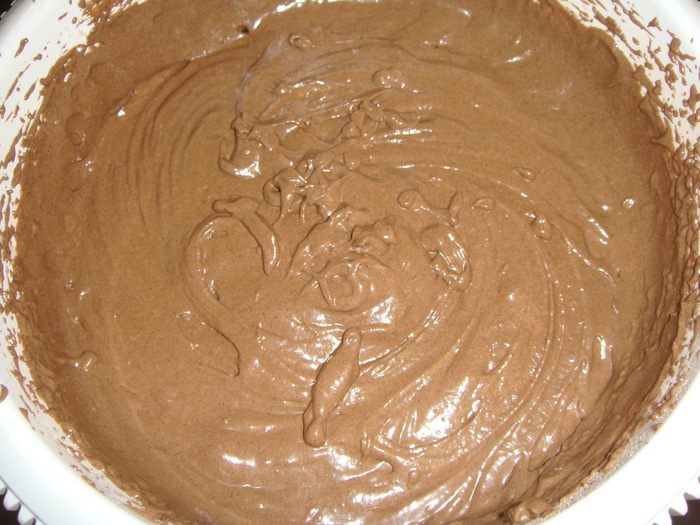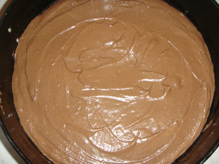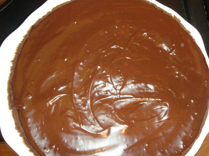 Выливаем шоколад на один корж и распределяем его по поверхности.