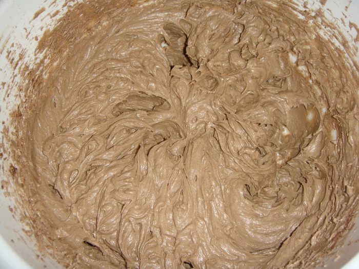 Для крема соединяем в чаше 100 г масла комнатной температуры, сгущенное молоко, ванильную творожную массу и взбиваем миксером. В конце добавляем 30 г какао и еще раз взбиваем.