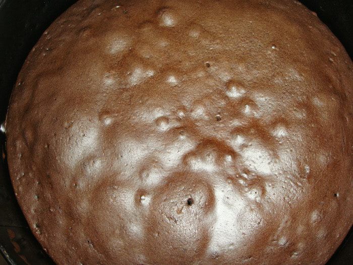 Дно формы для запекания застилаем пекарской бумагой. Выливаем половину теста и отправляем в разогретую до 180ºС духовку на 20 минут. Готовность проверяем зубочисткой. Так же печем второй корж.