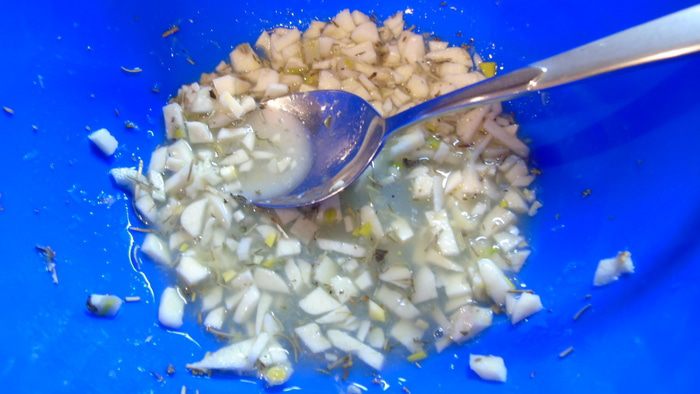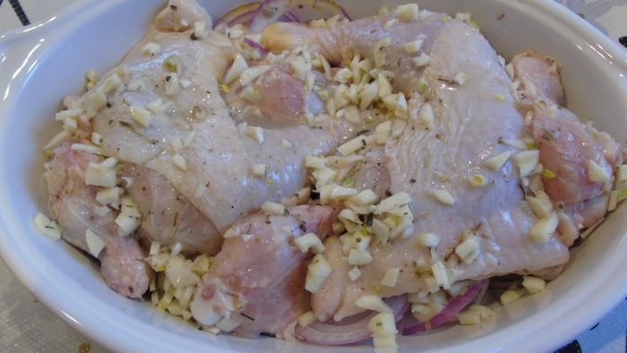 Нарезать чеснок и добавить к лимонному соку, добавить розмарин и тимьян (по рецепту свежий, у меня не было и я добавила сушеный), посолить и поперчить по вкусу.