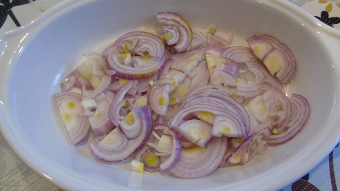 Лук нарежьте полукольцами и выложите в форму, полейте оливковым маслом.