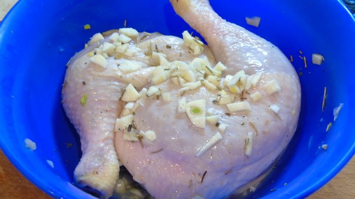 Цыпленка (у меня ножки) хорошо обвалять в маринаде и оставить на 30 минут мариноваться.