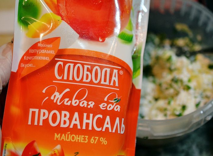 Добавить майонез, перемешать. Я использую майонез Провансаль ТМ «Слобода» — он не содержит крахмала и ГМО, прошел органик-контроль, сделан из натуральных ингредиентов и обладает высокими вкусовыми качествами.