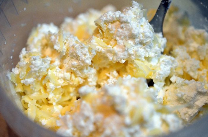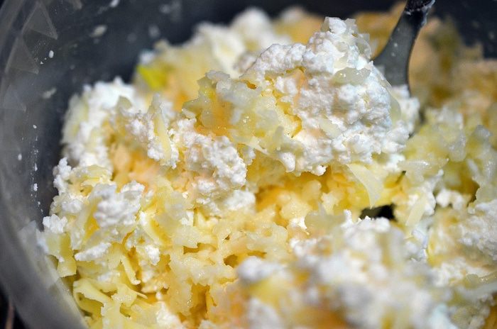 Сыр натереть на крупной терке, соединить с творогом.