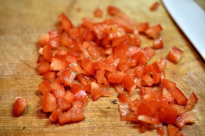Болгарский перец мелко порезать. Перец лучше брать цветной: красный, желтый, оранжевый.