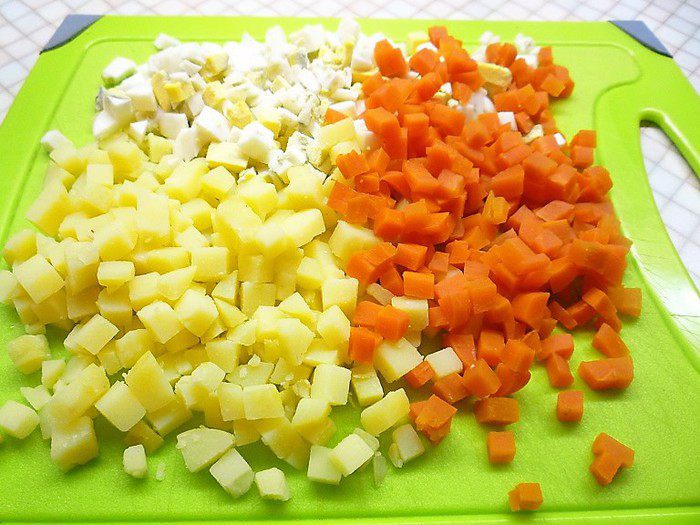 Картофель, морковь и яйца очищаем и нарезаем маленькими кубиками.